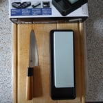 1/ Put the whet stones in water to remove air from inside them. You will see many bubbles come out of the whet stones. 5 to 10 minutes later, after the bubbles stop coming out, the whet stones are ready for sharpening. Prepare your table it for a good height and good balance when you are sharpening. Also it is good to prepare a towel to keep the whet stones from slipping.
