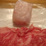 Mais quand il est allé voir le rayon boucherie, les mots lui ont manqué. Alors il a pris des photos. Pas seulement des deux types de Wagyu disponibles. Des autres aussi, surement bien plus impressionnants d'ailleurs. Car le wagyu, au delà de son affinage, on sait que c'est comme du caviar, le must, le nec plus ultra, le top... mais quand on voit comme il l'a vu le boeuf non-wagyu qui était proposé, on reste sans mots. Jamais - malgré la qualité de notre viande du Limousin, de notre Salers, de celle que l'on trouve dans les meilleures boucheries parisiennes comme chez Desnoyer ou Le Bourdonnec, et le savoir faire français en la matière - il n'a vu une telle viande, un tel marbrage sur un rayon dans notre beau pays. Ne pas en acheter pour le cuisiner rapidement à la guesthouse (disposant d'une grande cuisine libre d'accès, de tout ce qu'il faut, et de plaques à induction... qu'est ce qu'elle est bien cette guesthouse !) aurait été impardonnable. Pour une fois qu'il est au Japon, et a ça devant les yeux, il ne pouvait passer à coté. C'est donc deux morceaux de 60g de Black Japanese Regular Beef qu'il a mis sous son bras, en plein milieu d'une journée touristique à visiter le quartier, après avoir discuté 15 minutes avec la chef de rayon, qui avait l'air d'en connaitre un paquet mais n'avait pas l'anglais suffisant pour le dire. Il vous passe les détails, sauf un: au moment de payer, elle a glissé dans le sac deux morceaux de graisse pure provenant des desdits boeufs. Quel cadeau. A utiliser à la place du beurre ou de l'huile pour préparer les tranches, ou pour faire revenir des pommes de terre, des champignons, des légumes, faire frire tous les produits que vous souhaitez sublimer, ou encore se faire des oeufs brouillés au bacon du tonnerre un matin par exemple. Nous, plutôt que de les perdre, nous nous sommes contentés de les découper en petits cubes, puis de les faire frire, de les assaisonner à la fleur de sel (disponible à la guesthouse) et au poivre noir, et de les manger, un peu craquants sous la dent (mais fondant à l'intérieur). Tout simplement. Quel goût, un bonheur. Audrey en redemandait. La graisse n'était pas mousseuse, un peu comme celle qu'on trouve dans nos rillettes, mais un peu compacte, en se détachant par niveaux successifs, comme du saumon cru ou du thon pendant la découpe.