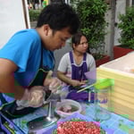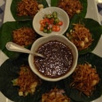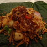 - Salade de "water grass", qui arrive dans un plat sous forme de boulettes croquantes, à napper avec une sauce à la cacahuète, piment, citron, dans laquelle baignent trois grosses crevettes. Le serveur nous explique aimablement comment manger cette entrée